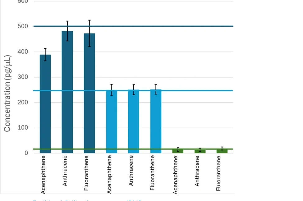 Discover piles of gold hiding beneath the limits of sensitivity. Thor's Hammer will find them on your LC-MS without sacrificing precision no matter how low under the baseline TH takes you (20x-100x lower). Figure - triplets. L-R, pg/uL: 500 (calibration curve), 250 (IDMS), 15 (TH-IDMS). 2025 R&D-100 Award Winner!